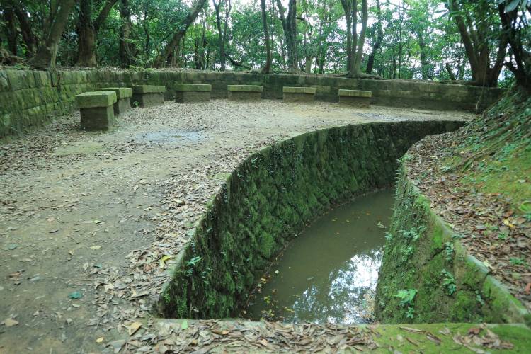 The stairs on the right lead to a round observatory (about 1.5m in diameter), piled up by rocks for observation of bomb landing and enemy movement:
