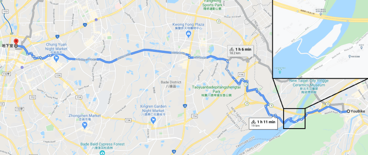 Just a random white squiggly line haphazardly drawn over the river. Note that the neighboring 鳶山堰 (Yuanshan weir) straddling the river – which could be a real crossing, I mean, it literally bridges the river – does not deserve even a walking path on Google maps. Granted, there is zero evidence from Google Street View that pedestrians can actually cross it (off-limits from the south side, impenetrable from the north), it’s just left me wondering – who drew the bogus bridge? And most importantly, why? I could understand if Google mapmakers map suppliers would have mistakenly marked the weir as a crossing – a straight-line walking path. That would have made sense. But no, instead I was left with a nondescript white winding… something, that even aspires to be a road, not just a bicycle path.